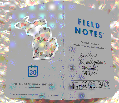 Notes: Even though it didn't work out in 2024, I thought I would take another shot at a year-long mini-writing project inside a Field Notes in 2025. It lasted admirably long; I kept it up for 30 consecutive weeks, took 7 weeks off, and then came back for another 4 weeks before hanging up the towel for the year. The idea was to write a sentence or two each day about something that happened or that I noticed or thought of. I am not the kind of person who can keep up these projects forever, however, and I honestly think 34 total weeks was pretty good. I will not be repeating another experiment in 2026, though. The book itself is special, of course. It's the other one that Aaron Draplin signed for me. The cover says, "Emily! You are golden! Stay cool! -- Aaron Draplin." He is a generous man in many dimensions.